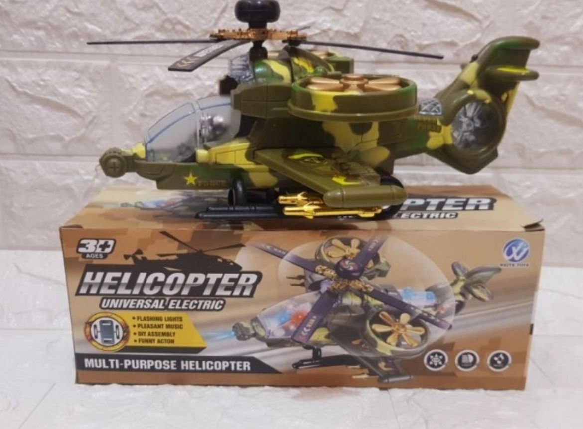 Helicóptero eléctrico multipropósito para niños, con luces intermitentes, sonidos divertidos y movimiento automático. Su diseño en camuflaje militar estimula la imaginación y ofrece horas de entretenimiento, perfecto para juegos creativos y desarrollo de habilidades motrices.