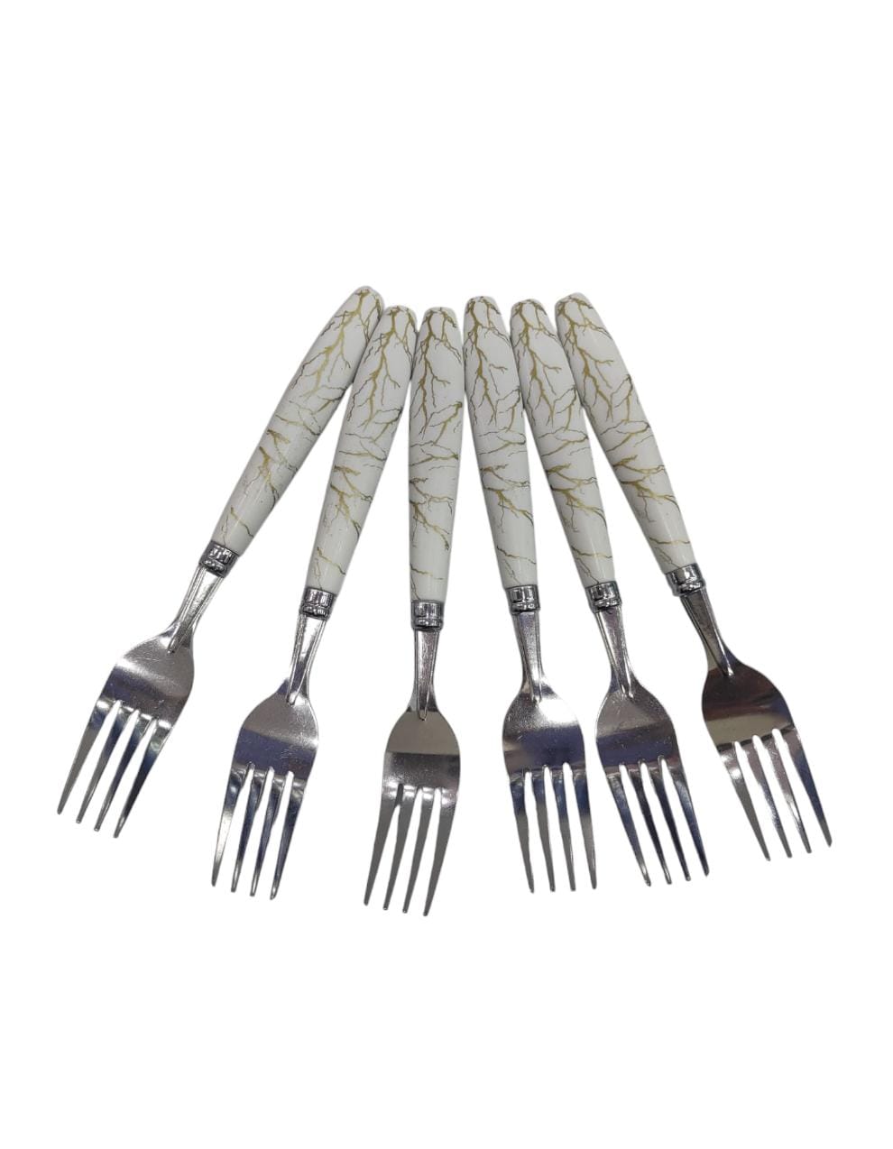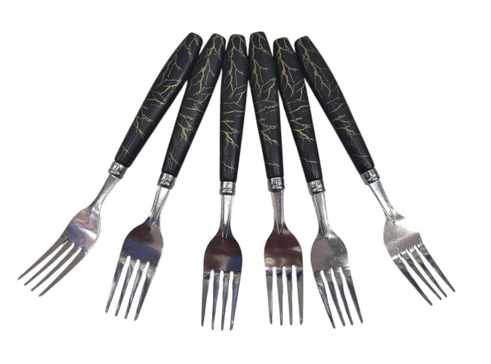 Cada tenedor es un pequeño lujo en tus manos. El mango, con su textura mármol y reflejos dorados, ofrece una sensación cálida y sofisticada, mientras que las puntas de acero pulido aseguran un uso cómodo y preciso. Tus comidas diarias se sentirán como cenas de gala.
